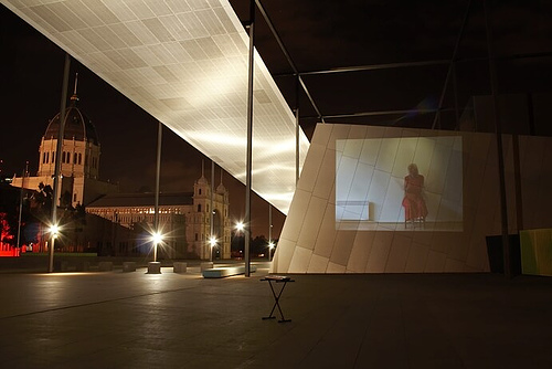 Bären Polka is an installation projected on the walls of Melbourne in various locations, including the façade of the Melbourne Museum. The video is a homage to the poet Paul Celan, experimenting with the gesture of piano playing devoid of the instrument, and the dissonance of a relentless loop of cheap muzak from a toy instrument, positioned as installation in the public context of the projection.